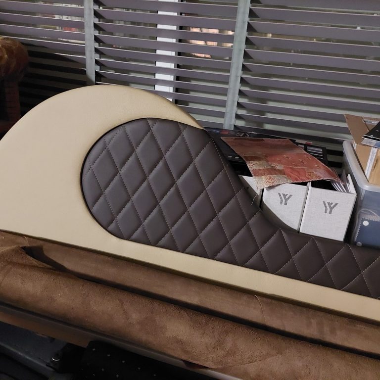 Bij een prijsopgave nemen wij diverse stalen mee, zodat u ter plekke of thuis rustig een keuze kunt maken. U kunt ook altijd met uw kussens of tekening bij ons langskomen, zodat u zich gelijk kunt laten overtuigen van de enorme keuze in bekledingsmateriaal, koudschuim-, lastilux- of polyethervullingen. Zoals u op de foto’s kunt zien, borduren wij ook logo’s in stof of (kunst)leder (zie bijv. het Maserati logo).
